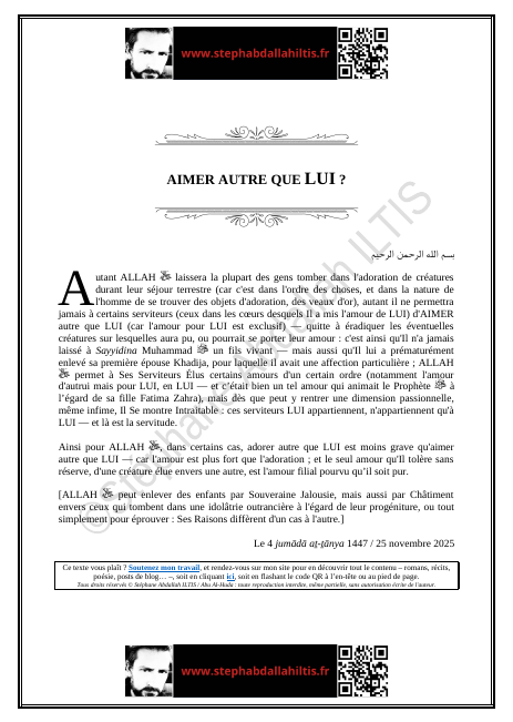 « Autant ALLAH ﷻ laissera la plupart des gens tomber dans l’adoration de créatures durant leur séjour terrestre (car c’est dans l’ordre des choses, et dans la nature de l’homme de se trouver des objets d’adoration, des veaux d’or), autant il ne permettra jamais à certains serviteurs (ceux dans les cœurs desquels Il a mis l’amour de LUI) d’AIMER autre que LUI (car l’amour pour LUI est exclusif)… »