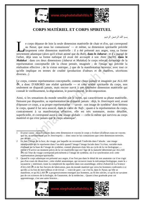 « Le corps dépasse de loin la seule dimension matérielle de chair et d’os, qui correspond au Nasut, que nous lui connaissons — et même, sa dimension spirituelle précède largement cette dimension matérielle… »
