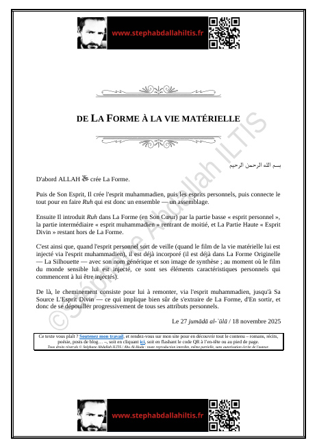 Étiquettes : ALLAH ﷻ, Cœur, Esprit Divin, Esprit muhammadien, Esprit personnel, Forme, Image de synthèse, Monde sensible, Nom générique, Ruh, Vie matérielle