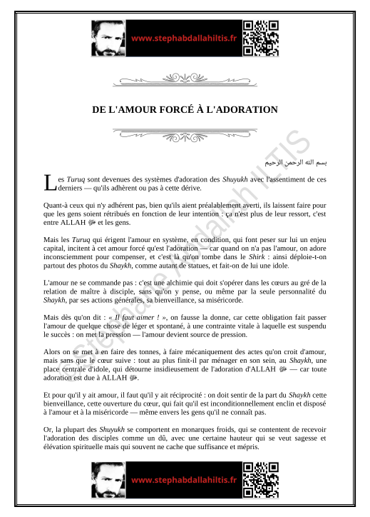 Étiquettes : Adoration, ALLAH ﷻ, Amour, Cœur, Disciple, Idole(s), Intention, Maître spirituel, Miséricorde, Murshid, Shaykh/Shuyukh, Shirk, Tariqa/Turuq, Walî