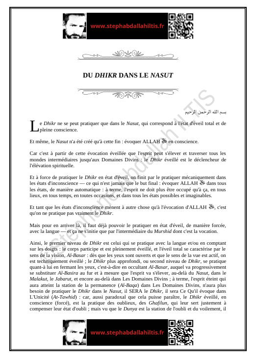 « Le Dhikr ne se peut pratiquer que dans le Nasut, qui correspond à l’état d’éveil total et de pleine conscience.