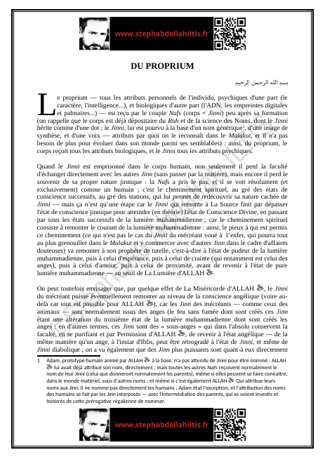 « Le proprium — tous les attributs personnels de l’individu, psychiques d’une part (le caractère, l’intelligence…), et biologiques d’autre part (l’ADN, les empreintes digitales et palmaires…) — est reçu par le couple Nafs (corps + Jinni) peu après sa formation… »