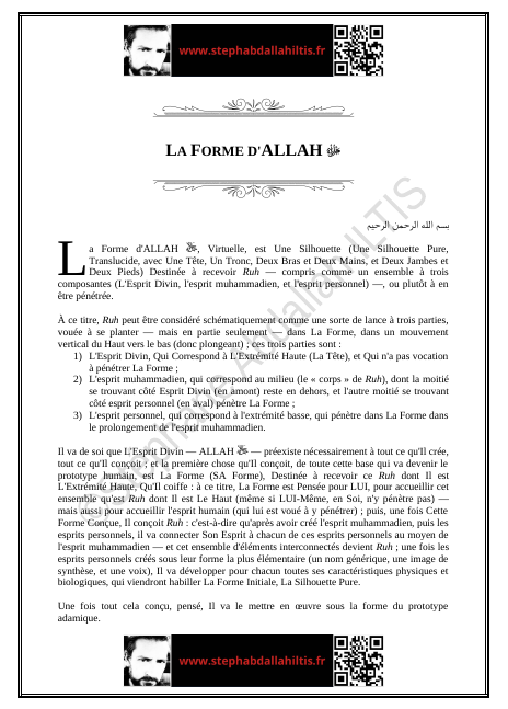 « La Forme d’ALLAH ﷻ, Virtuelle, est Une Silhouette (Une Silhouette Pure, Translucide, avec Une Tête, Un Tronc, Deux Bras et Deux Mains, et Deux Jambes et Deux Pieds) Destinée à recevoir Ruh — compris comme un ensemble à trois composantes (L’Esprit Divin, l’esprit muhammadien, et l’esprit personnel) —, ou plutôt à en être pénétrée… »