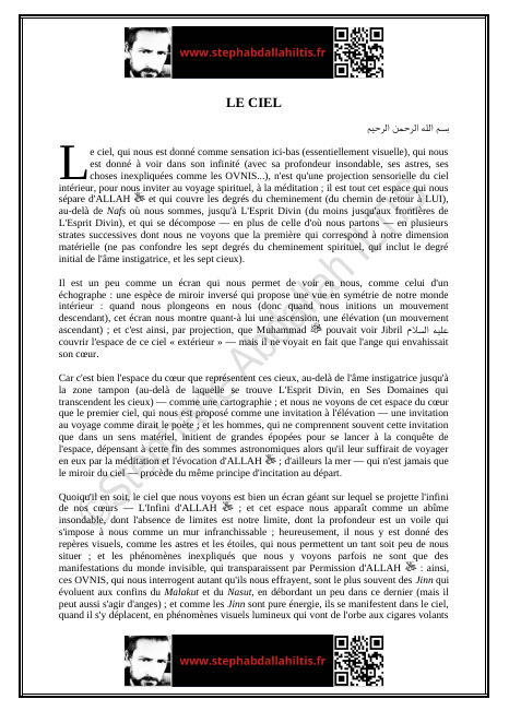 « Le ciel, qui nous est donné comme sensation ici-bas (essentiellement visuelle), qui nous est donné à voir dans son infinité (avec sa profondeur insondable, ses astres, ses choses inexpliquées comme les OVNIS…), n’est qu’une projection sensorielle du ciel intérieur, pour nous inviter au voyage spirituel, à la méditation… »