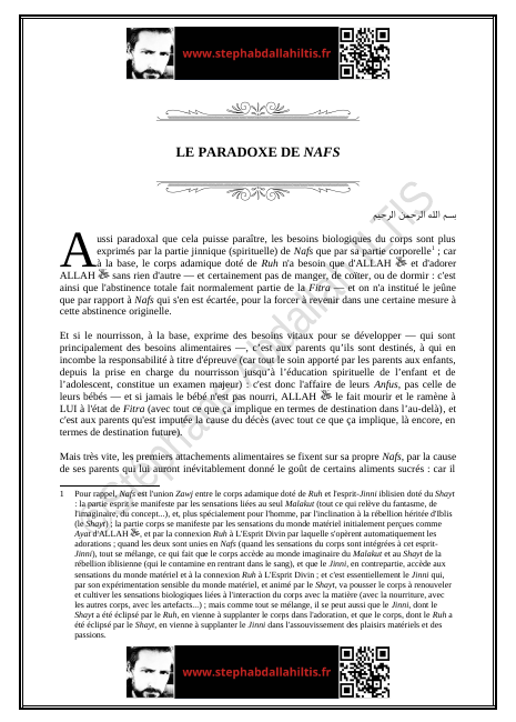« Aussi paradoxal que cela puisse paraître, les besoins biologiques du corps sont plus exprimés par la partie jinnique (spirituelle) de Nafs que par sa partie corporelle ; car à la base, le corps adamique doté de Ruh n’a besoin que d’ALLAH ﷻ et d’adorer ALLAH ﷻ sans rien d’autre — et certainement pas de manger, de coïter, ou de dormir… »