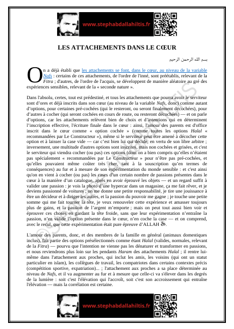 « On a déjà établi que les attachements se font, dans le cœur, au niveau de la variable Nafs : certains de ces attachements, de l’ordre de l’inné, sont préétablis, relevant de la Fitra ; d’autres, de l’ordre de l’acquis, se développent de manière aléatoire au gré des expériences sensibles, relevant de la « seconde nature »… »