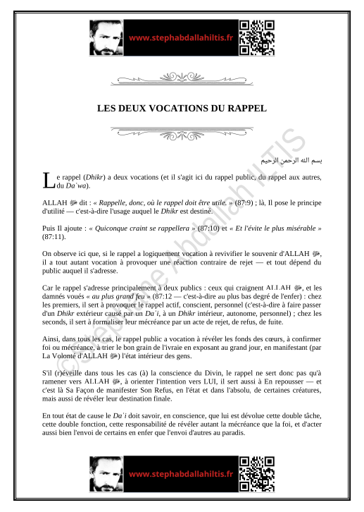 « Le rappel (Dhikr) a deux vocations (et il s’agit ici du rappel public, du rappel aux autres, du Daʿwa).