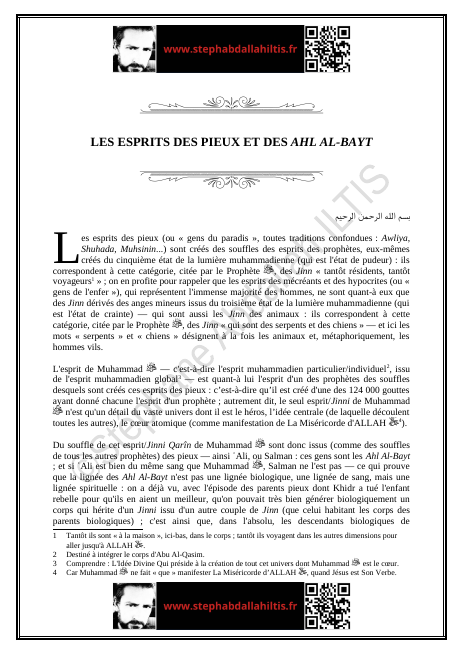 « Les esprits des pieux (ou « gens du paradis », toutes traditions confondues : Awliya, Shuhada, Muhsinin…), sont créés des souffles des esprits des prophètes, eux-mêmes créés du cinquième état de la lumière muhammadienne (qui est l’état de pudeur) : ils correspondent à cette catégorie, citée par le Prophète ﷺ, des Jinn « tantôt résidents, tantôt voyageurs »… »