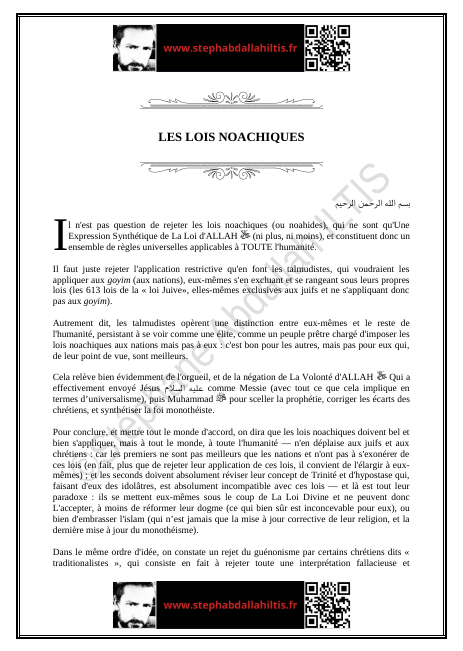 « Il n’est pas question de rejeter les lois noachiques (ou noahides), qui ne sont qu’Une Expression Synthétique de La Loi d’ALLAH ﷻ (ni plus, ni moins), et constituent donc un ensemble de règles universelles applicables à TOUTE l’humanité… »
