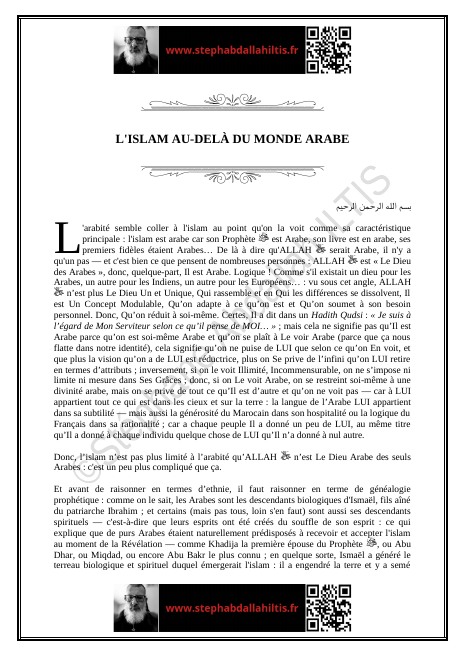 « L’arabité semble coller à l’islam au point qu’on la voit comme sa caractéristique principale : l’islam est arabe car son Prophète ﷺ est Arabe, son livre est en arabe, ses premiers fidèles étaient Arabes… De là à dire qu’ALLAH ﷻ serait Arabe, il n’y a qu’un pas… »