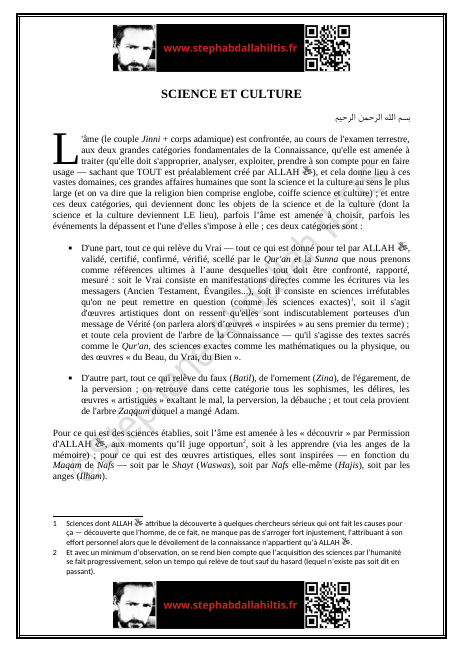 « L’âme (le couple Jinni + corps adamique) est confrontée, au cours de l’examen terrestre, aux deux grandes catégories fondamentales de la Connaissance, qu’elle est amenée à traiter (qu’elle doit s’approprier, analyser, exploiter, prendre à son compte pour en faire usage — sachant que TOUT est préalablement créé par ALLAH ﷻ), et cela donne lieu à ces vastes domaines, ces grandes affaires humaines que sont la science et la culture au sens le plus large… »