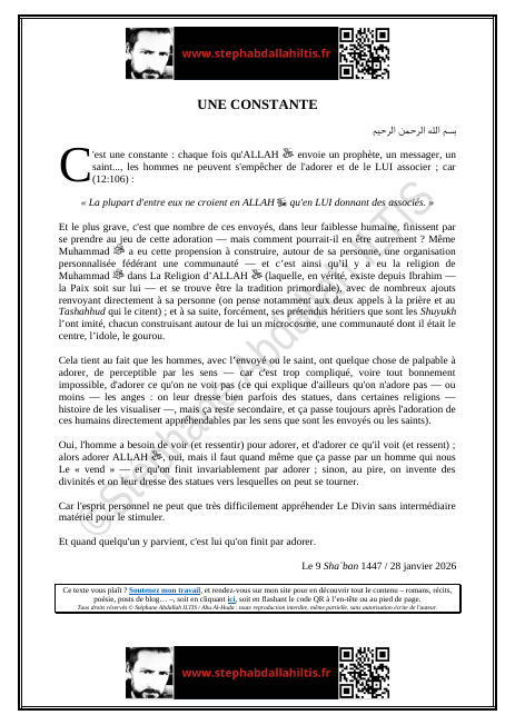 « C’est une constante : chaque fois qu’ALLAH ﷻ envoie un prophète, un messager, un saint…, les hommes ne peuvent s’empêcher de l’adorer et de le LUI associer… »
