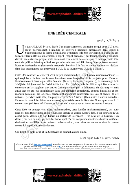 « Un jour ALLAH ﷻ a eu l’idée d’un microcosme (ou du moins ce qui pour LUI n’est qu’un microcosme), a imaginé un univers à plusieurs dimensions dans lequel Il S’adorerait sous la forme de milliards d’humains… »
