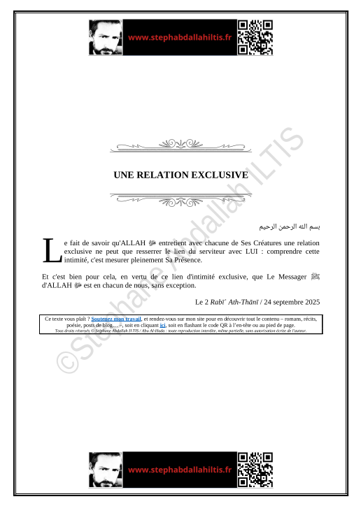 « Le fait de savoir qu’ALLAH ﷻ entretient avec chacune de Ses Créatures une relation exclusive ne peut que resserrer le lien du serviteur avec LUI… »