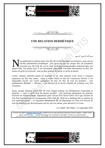 « Non seulement la relation entre ALLAH ﷻ et Son Serviteur est exclusive, mais encore est-elle parfaitement hermétique : pris qu’on est par son propre flux de sensations envoyées par ALLAH ﷻ via le canal de l’esprit muhammadien (enfermé dans son propre film, son propre jeu), il est strictement impossible d’accéder directement au flux des autres tel qu’ils le reçoivent… »