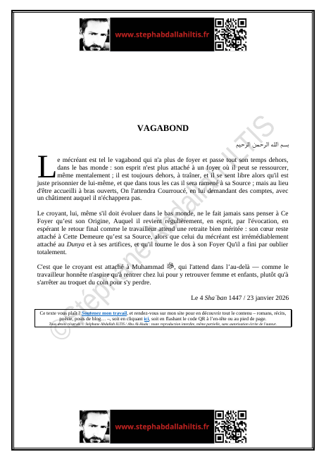 « Le mécréant est tel le vagabond qui n’a plus de foyer et passe tout son temps dehors, dans le bas monde : son esprit n’est plus attaché à un foyer où il peut se ressourcer, même mentalement ; il est toujours dehors, à traîner, et il se sent libre alors qu’il est juste prisonnier de lui-même… »
